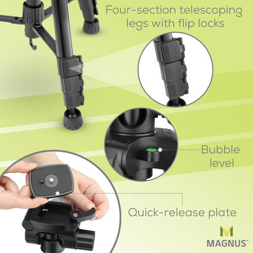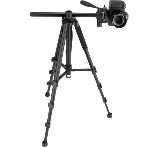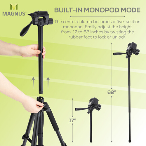 The LM-700 Lateral Aluminum Tripod with Monopod from Magnus is a sturdy, all-weather aluminum tripod with a pan-and-tilt head that supports up to 10 pounds of photo or video gear. It features a removable center column that becomes a five-section monopod suitable for outdoor, nature, and sports photography. The LM-700's center column also offers a convenient lateral option for extending a camera horizontally out from the tripod and suspending it over a subject when shooting documents or artwork. The LM-700 has a maximum height of 70 inches, folds down to a compact 23 inches, and includes a nylon carrying bag with shoulder strap for transport and storage.